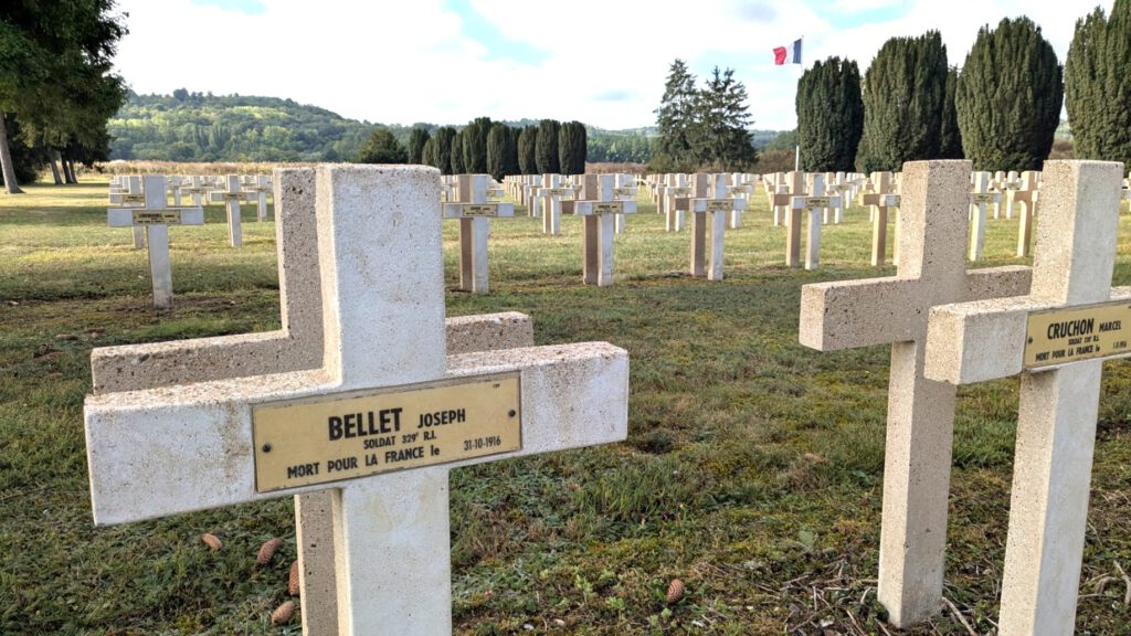 Bei unserer Fahrt nach Reims fuhren wir durch das Tal der Aisne, wo wir bereits Weinberge erwarteten. Was wir aber sahen, waren unzählige Soldatenfriedhöfe. Wir fuhren ja durch das Gebiet, in dem im Ersten Weltkrieg viele Schlachten geschlagen wurden.