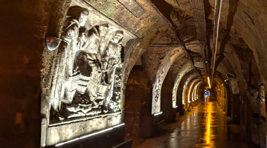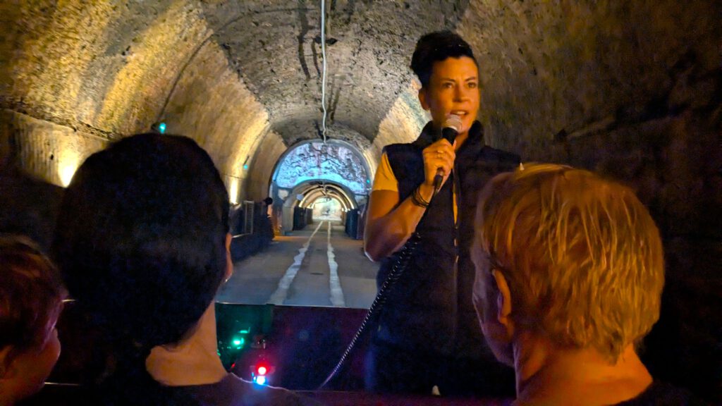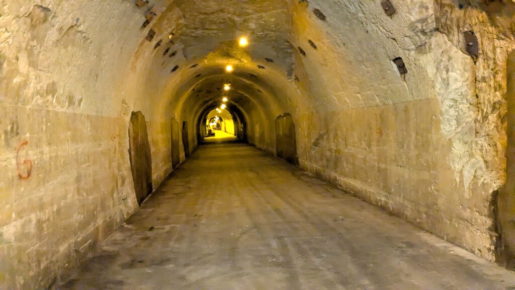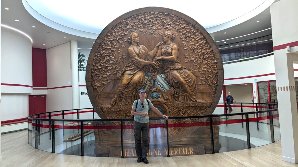 Heute, nach dem wir über ein Woche in der Champagne waren (lassen wir mal die Paris-Tage weg) gab es den ersten Champagner für uns. Wir hatten eine Besichtigung beim Champagnerhaus Mercier in der Avenue de Champagne gebucht. Die haben zwar „nur“ 18 km Weinkeller, aber auch eine Art Zug, wo man bequem im Sitzen die Stollen erkunden kann. Diese befinden sich in 30 m Tiefe und es herrschen konstante 10 Grad. Vom gelagerten Champagner sieht man nicht so viel, die von Mercier wollen sich nicht so in die Karten schauen lassen, wieviel sie im Vorrat haben. Mercier gehört übrigens Moët & Chandon und diese wiederum zum Luxusgüterkonzern LVMH (Moët Hennessy – Louis Vuitton SE)